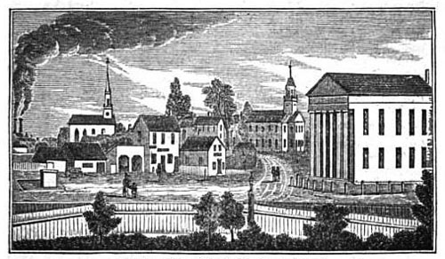 1. 1839 John Warner Barber drawing of Town Hall with historian Russell Lovell stating “This is the only view found showing the early Calvinistic chapel on the site of the present First Church of Christ. The smaller buildings in the left foreground are a blacksmith shop, the building (Spite Barn) that was to become part of the glass museum and lastly the Fred Bunker museum.