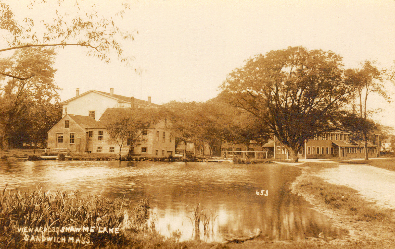 Postcard ca. 1915 showing Town Hall, Grist Mill, Tag Factory and Shoe Factory on Shawme Pond (Click for Larger View)