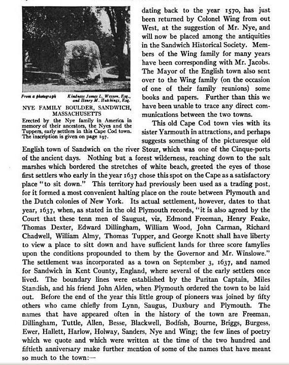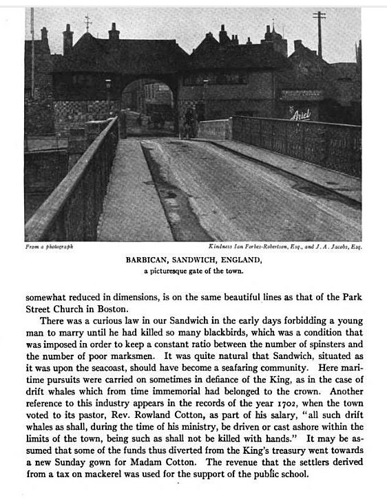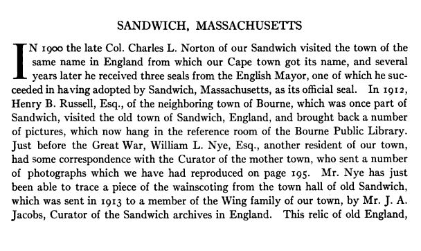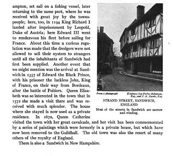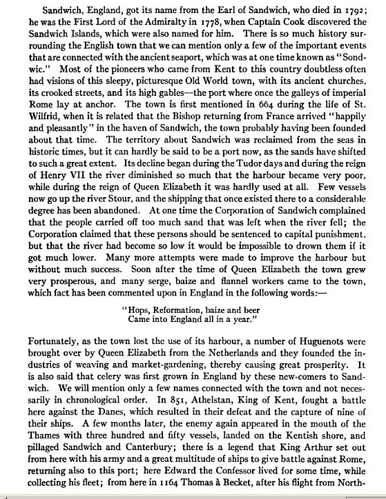 Sandwich, Massachusetts is named for the seaport of Sandwich, Kent, England. The name “Sandwich” comes from Old English (O.E.) Sandwic, and literally means “sand village,” “sandy place,” or “place on the sand.” The old English wic is a loan word from Latin vicus, which also gives us the word vicinity. The word “sandwich” as an item of food came into being centuries later (we’ll get to that in a bit) . The first recorded mention of Sandwich in the United kingdom was around 664 AD but there was probably some kind of settlement in Roman times as the site is very close to a Roman Fort (Rutupiae).